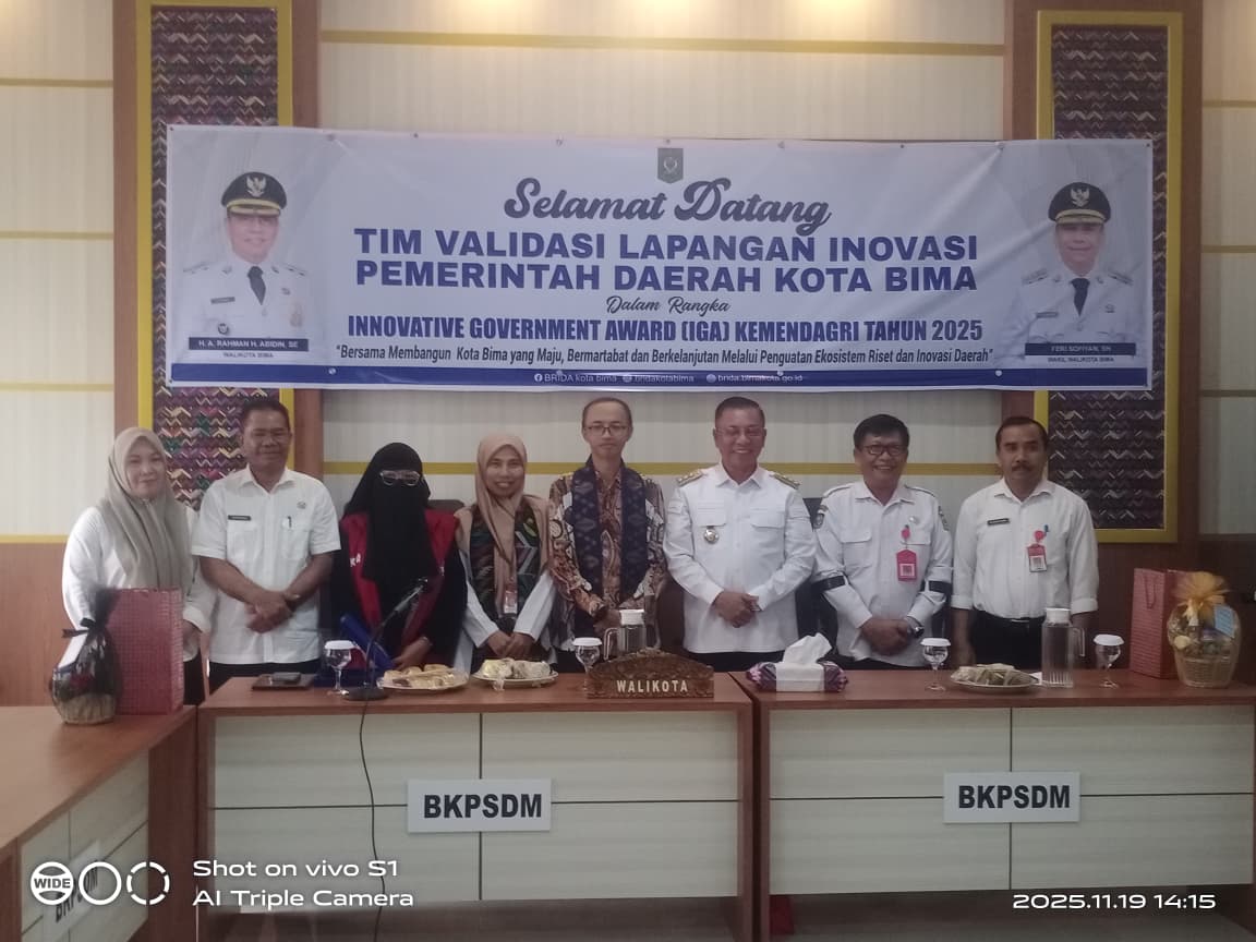 Wali Kota Bima, A Rahman H Abidin, SE, dan sejumlah pejabat Pemkot Bima termasuk Kepala BRIDA, Arif Roesman Effendy, ST, M.Sc, MT, menyambut Kedatangan tim penilai dari Kementerian Dalam Negeri (Kemandagri) RI untuk melakukan validasi lapangan terkait dua inovasi unggulan Kota Bima dalam penilaian IGA tahun 2025. Keduanya diterima oleh Wali Kota dan pejabat Pemkot di Aula BKPSDM Rabu (19/11/2025).