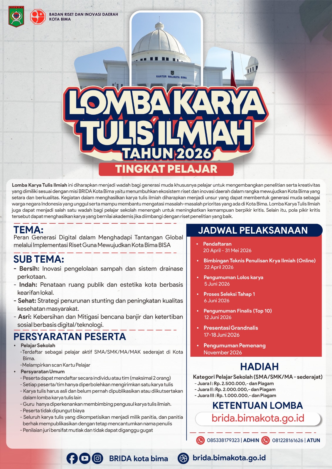 Rangkaian seleksi akan berlangsung secara bertahap, dimulai dari pengumuman lolos karya pada awal Juni hingga puncaknya pada presentasi Grand Final bagi sepuluh besar finalis di pertengahan Juni 2026. Para pemenang nantinya akan mendapatkan piagam penghargaan serta total hadiah jutaan rupiah yang akan diumumkan pada bulan November 2026. Bagi pelajar yang berminat, seluruh informasi mengenai ketentuan lomba dan proses pendaftaran dapat diakses melalui situs resmi brida.bimakota.go.id . Untuk layanan tanya jawab dan informasi mengenai kegiatan dapat menghubungi layanan narahubung yang tersedia.(PPID-BRIDA)
